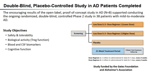 该研究共纳入了38例年龄在50-86岁之间、简易精神状态量表(MMSE)评分在12-26分之间的早期AD患者,在38名参与者中,22人以1:1的比例随机接受5天的LD IL-2(100万IU/天)或安慰剂,每4周为一个周期,持续21周。治疗后对所有参与者进行9周的监测,总研究期为30周。