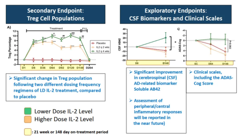 此外,每月一次LD IL-2治疗的患者阿尔茨海默病评估量表认知子量表(ADAS-Cog)评分在21周治疗期间较安慰剂组改善了4.93分(p=0.061),脑脊液(CSF)中的淀粉样蛋白42(Aβ42)水平升高,表明淀粉样蛋白-β清除率增加,CSF中神经丝轻链(NfL)水平稳定,与安慰剂相比具有显著统计学差异。