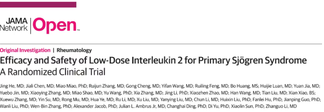 北京大学人民医院栗占国教授团队在JAMA Network Open (IF=13)杂志发表了一项原发性干燥综合征免疫治疗的研究成果:Efficacy and Safety of Low-Dose Interleukin-2 for Primary Sjögren’s Syndrome: A Randomized Clinical Trial。该研究证明了低剂量IL-2(每隔一天接受100IU IL-2,持续2周,随后停药2周,此过程为一个疗程,共3个疗程)治疗原发性干燥综合征的有效性以及安全性。作者研究了低剂量IL-2治疗后,患者的临床症状和免疫失调显著改善,为干燥综合征免疫治疗提供了临床和实验依据。