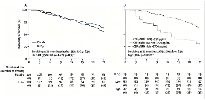 基于预设预后协变量(包括 CSF-pNFH、年龄、ALSFRS-R 评分等)的 Cox 模型调整分析显示,IL-2 组死亡风险显著降低 68%,且治疗效果与CSF-pNFH 水平存在显著交互作用;