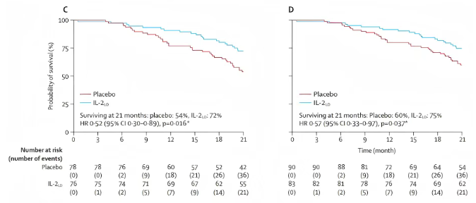 结果显示,220 例随机分配患者中,未经调整的生存分析显示,IL-2组死亡风险降低 19%;