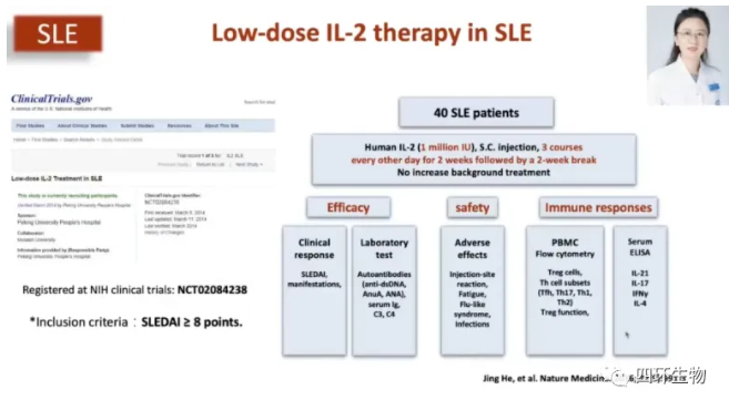 北大人民医院栗占国教授团队通过严谨的RCT,证实了低剂量IL-2 对系统性红斑狼疮(SLE)的治疗作用和安全性。本项RCT证实低剂量IL-2治疗后,患者的临床症状、免疫指标以及疾病活动指数均有改善,且患者耐受性好,无明显不良反应;