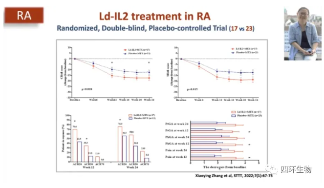 低剂量IL-2在治疗类风湿关节炎方面也显示出喜人的免疫治疗成果:Efficacy and safety of Ld-IL2 in combination with MTX in patients with active RA: a randomized trial。该研究证明了低剂量IL-2治疗类风湿关节炎的有效性以及安全性。接受治疗的患者中未发现明显不良反应,无骨髓抑制、肝肾功能损害、感染等;