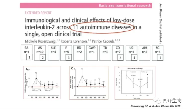 Rosenzwajg教授等发表论文,临床研究显示,低剂量 IL-2 对类风湿关节炎( rheumatoid arthritis, RA) 、强直性脊柱炎( ankylosing spondylitis,AS) 等 11 种自身免疫性疾病均安全有效;