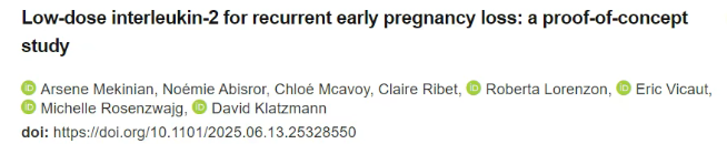 Mekinian A, Abisror N, Mcavoy C, et al. Low-dose interleukin-2 for recurrent early pregnancy loss: a proof-of-concept study. medRxiv. 2025; DOI: 10.1101/2025.06.13.25328550