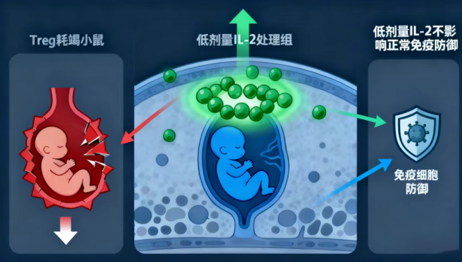 动物实验进一步验证了这一机制:Treg耗竭的小鼠会自发性排斥同种异体胎儿,而LD-IL2可通过选择性激活Treg,恢复小鼠正常妊娠率。与高剂量IL-2激活效应细胞不同,低剂量方案能精准靶向Treg扩增,且不影响正常免疫防御功能,这为其临床应用提供了理论支撑。