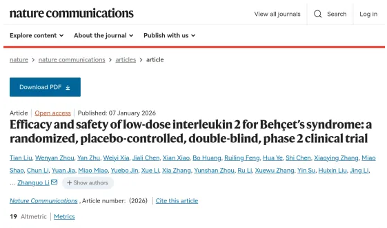近日,北京大学人民医院风湿免疫科栗占国教授团队在国际权威期刊Nature子刊Nature Communications在线发表了低剂量白介素-2(Ld-IL2)治疗白塞病(BD)的研究成果:“Efficacy and safety of low-dose interleukin 2 for Behçet’s syndrome: a randomized, placebo-controlled, double-blind, phase 2 clinical trial”。