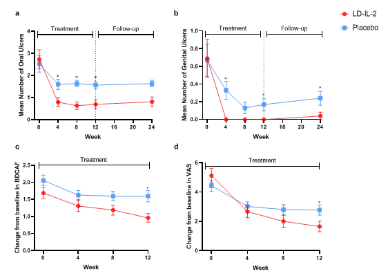 研究中,患者被随机分为两组,分别接受Ld-IL2治疗(100 万 IU ,皮下注射,隔日一次,治疗 12 周,后续随访 12 周。)和安慰剂治疗,核心观察终点包括治疗12周时的口腔溃疡数目、外阴溃疡数目、疼痛评分、疾病活动度评分及生活质量评分等多项指标,同时延伸观察至24周以评估疗效持续性。